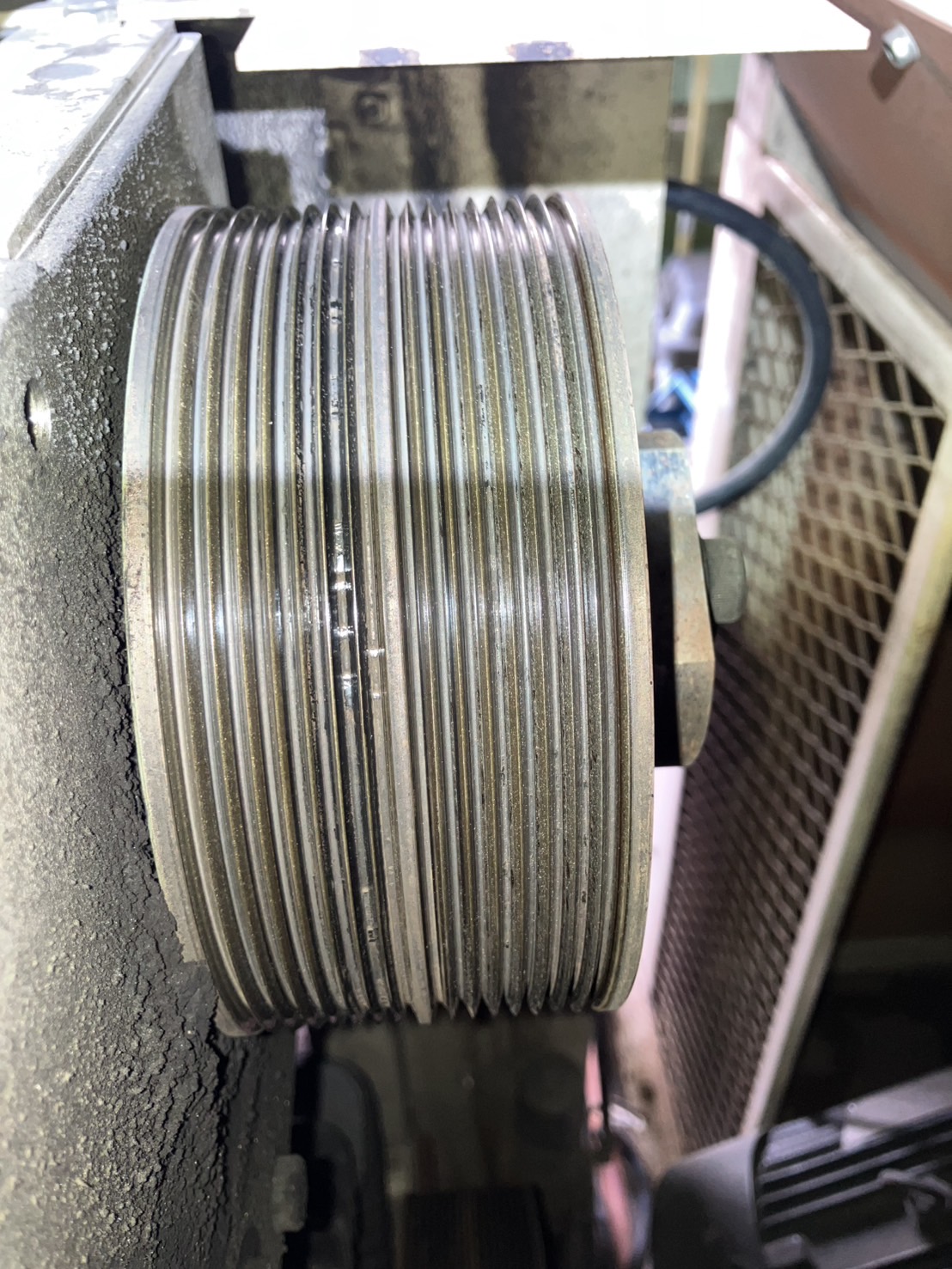 ロード(稼働状態)とアンロード(待機状態)の周期が、1分以内になっている様なお客様のVベルトが伸びてしまい、バタバタと音を立てながら回っているのをよく見ます。
